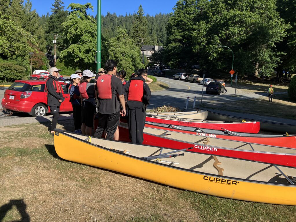 Group preparing for an overnight trip with 5 canoes,.out of Deep Cove