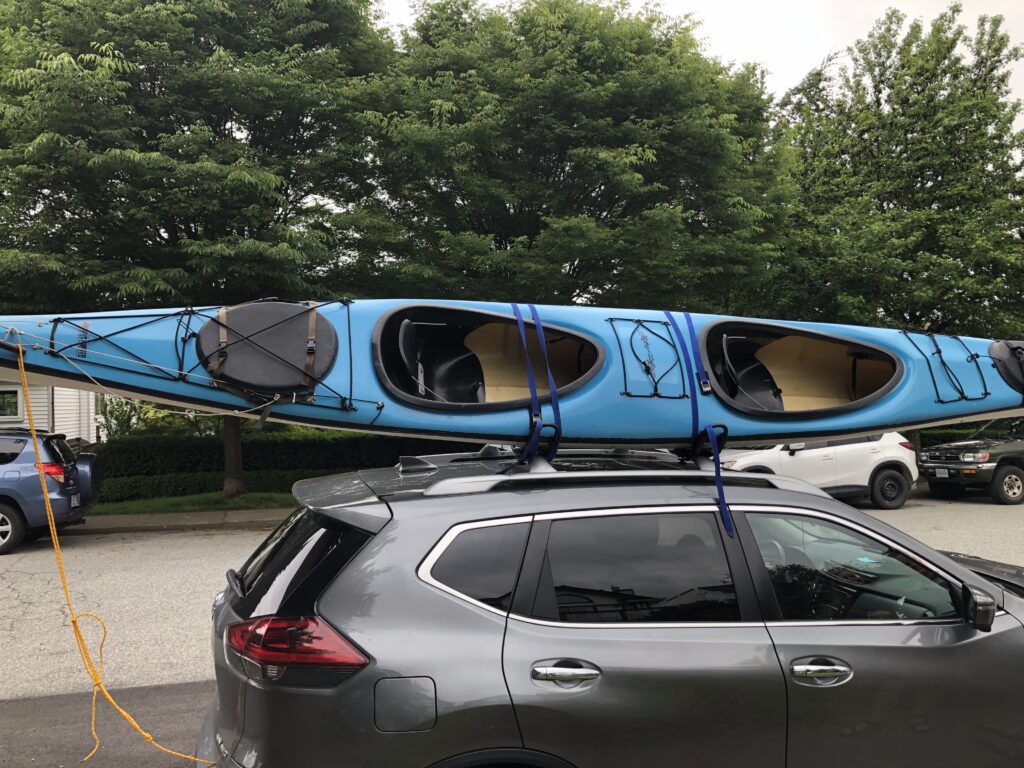 Our 2 Nimbus double sea kayaks : are the Hyak 19ft 2 inches fibreglass, with 2 hatches and rudder, the Seafarer 20ft fibreglass, 2 with dry hatches and rubber . In addition we have a Seaward Passat 22ft double w/ 2 hatches & rudder. All double rentals are supplied with 3 paddles each, two neoprene spray skirts, PFDs (life vests) regulation rope bags , paddle float and pump, cam straps and foam pads for car roof transportation. we will help you load and show strap down methods. Depending on your roof rack, a rack extender is available to carry two kayaks at the same time. We feature rack extenders allowing one car to carry 2 kayaks, subject to the design of your car or SUV rails or rack, which must be approved by us before accepting the extension,